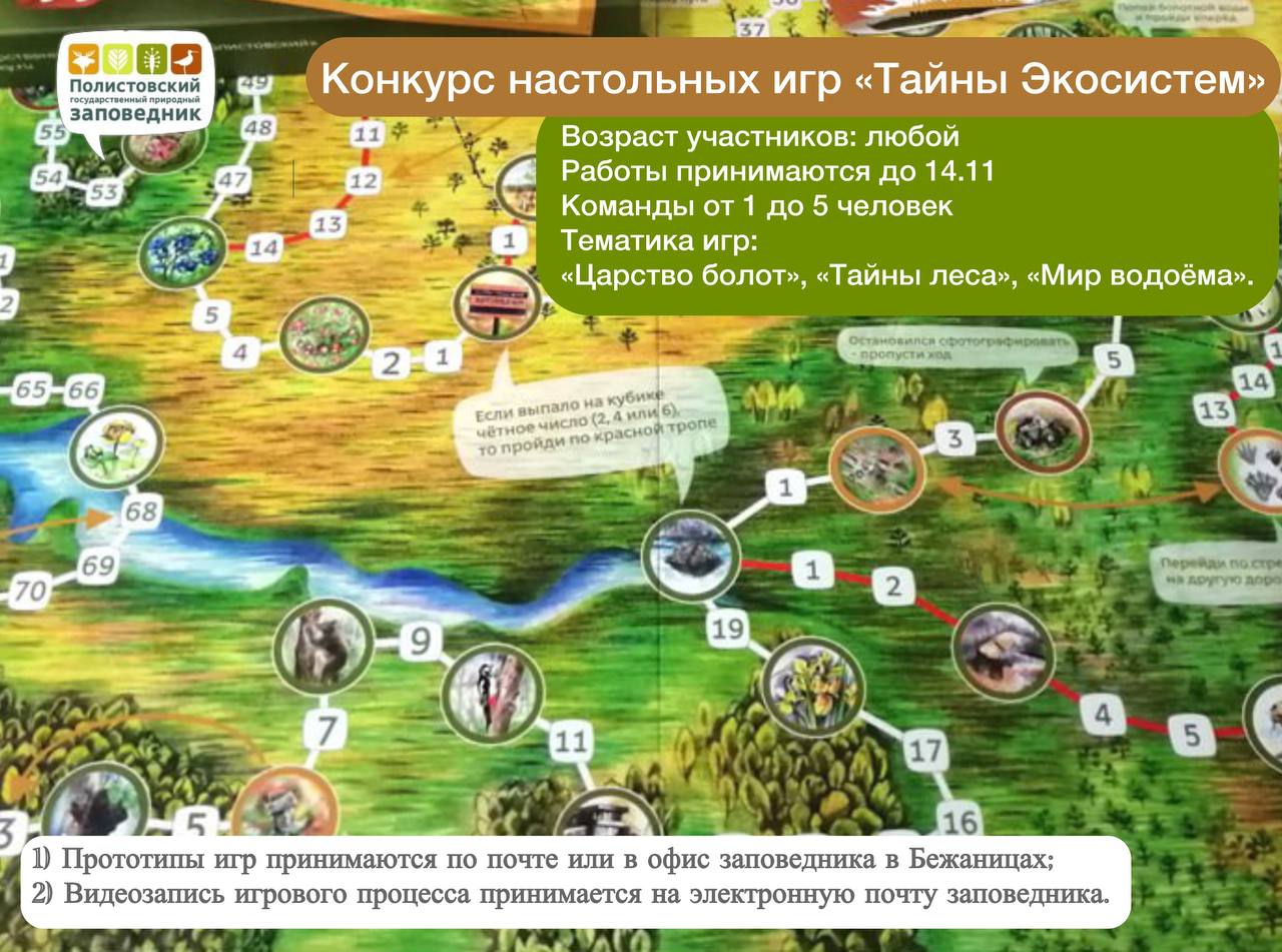 На конкурс нужно представить полный комплект игры: игровое поле (если нужно), карточки, фишки, жетоны, кубики и чёткие правила на отдельном листе формата А4 - по почте или передать лично в офис заповедника: 182840 Псковская область, п. Бежаницы, ул. Советская, д. 9Б.